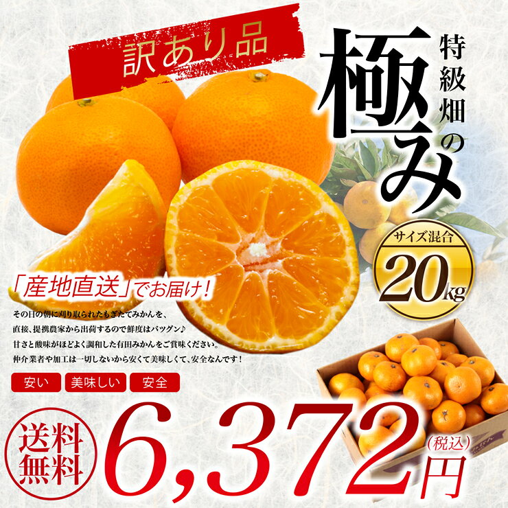 価格: 4,980円 レビュー評価:3.6 レビュー数:5 和歌山県産 有田みかん お徳用 小玉 (S-2Sサイズ) 10kg [訳あり]【送料無料】 賞味期限:2週間(14日)を目安にお召し上がりください。 保存方法:高温多湿を避け風通しの良い所で保存して下さい。 注)こちらの商品はメーカーより直送の為、代金引換決済がご利用頂けません。 送料無料でございますが、北海道、沖縄、離島はプラス1,000円頂きます。和歌山県産 有田みかん お徳用 小玉 (S-2Sサイズ) 10kg [訳あり]【送料無料】※代金引換不可 和歌山県産の有田みかん早生(S?2S)サイズです。こだわりのスーパーマルチ栽培 にてとっても甘く仕上がりました。 訳あり→表面に成長段階でできた葉っぱでのスレやキズのついたみかんが混じる事がございますがお味には支障なく美味しくお召し上がりいただけます。 お召し上がりの際にみかんを少し手で揉むとみかんの酸味が和らぎさらに美味しさが増しますよ (更新日時:2017/12/15 18:16) Supported by 楽天ウェブサービス |